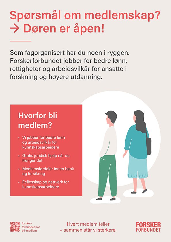 Plakat for kontordør som synliggjør fordeler med medlemskap i Forskerforbundet og inviterer til samtale om fagorganisering. Skrives ut i ønsket format
